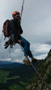 Manuel Jaider nimmt die Seillänge in Angriff. Nach einer kurzen Schleife nach links geht es über einen Riss hoch in welchen er die Friends platziert. Er richtet den Standplatz ein, verbindet die geschlagenen Nägel vorbildhaft und sichert mich nach. Am Stand ist ihm die Freude über die Begehung der Seillänge deutlich anzumerken. Ich halt den Moment fotografisch fest und nach Materialtausch klettere ich weiter. Ohne Manuel nachzusichern, seile ich mich nach 30m an 2 Nägel und einem Friend wieder ab. Glücklich über die schönen Seillängen und mit der Zuversicht baldmöglichst wieder gemeinsam weiterzumachen, steigen wir nach Seis ab.