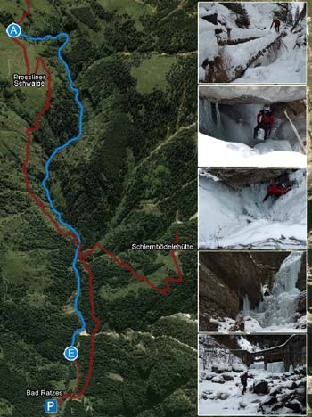 Beschreibung: Immer wieder interssante Tour. Wasserlöcher, Steilstufen oder Bäume versperren zwischendurch den Weg und diese gilt es bei der Begehung des Frötschbaches zu überklettern bzw. zu umgehen. Eine Begehung ist nur bei besten Verhätnissen zu empfehlen und selbst dann sollten man sich Socken zum wechseln mitnehmen. Eistechnisch relativ einfach, aber aufgrund der Länge und Abgeschiedenheit nicht zu unterschätzen.