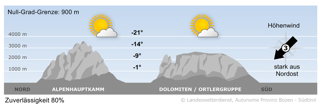 Das Wetter heute: Abgesehen von ein paar Restwolken am Morgen scheint in allen Gebirgsgruppen die Sonne bei ausgezeichneter Fernsicht. Es ist sehr kalt und dazu weht teils kräftiger Wind aus Nordost.